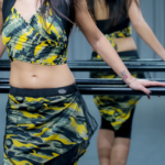 Ensemble deux-pièces legging court, confortable dans une belle matière fluide avec élasthanne; imprimé moderne noir et jaune
